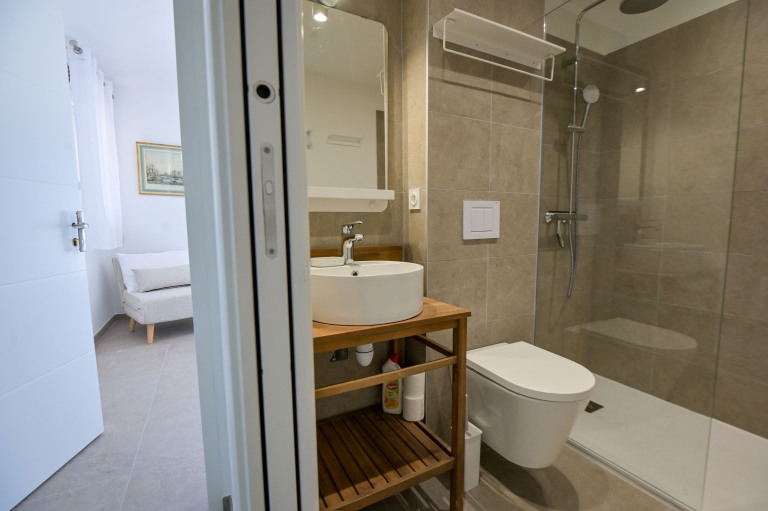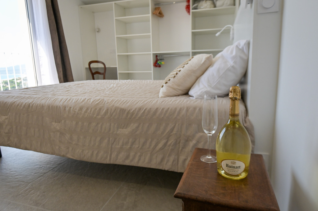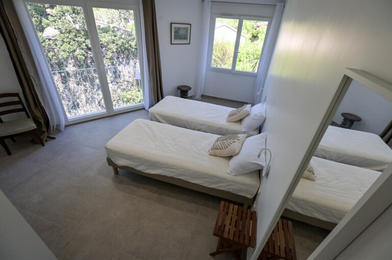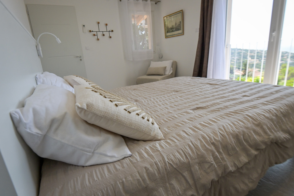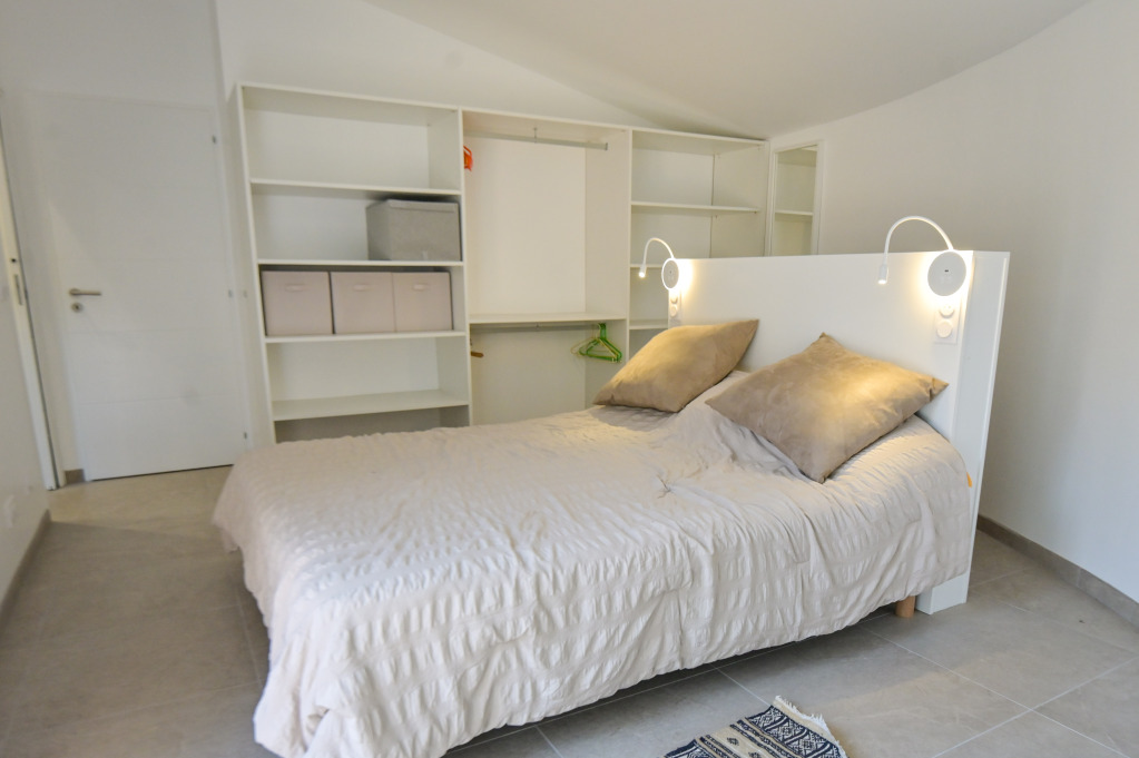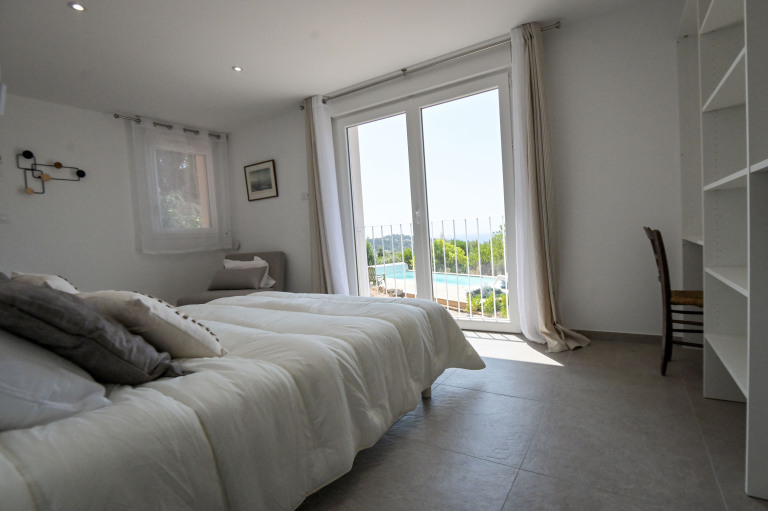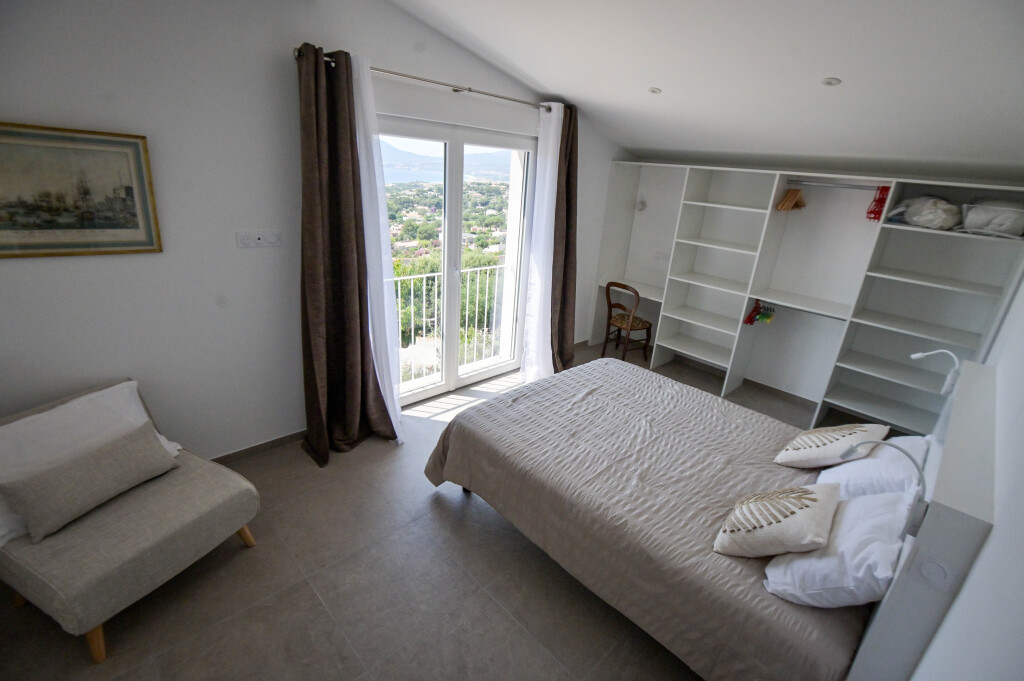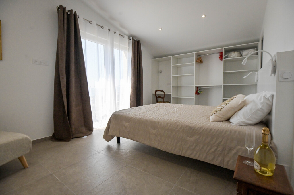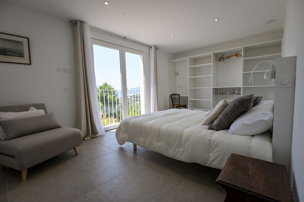 - Cinq grandes chambres indépendantes avec rangements intégrés, chacune avec terrasse attenante ou vue sur mer ou sur montagne. Trois chambres sont équipées de lits queen-size (160 cm), tandis que deux autres chambres sont pourvues de deux lits simples qui peuvent être réunis (80+80 cm), parfaites pour les enfants ou adolescents. Chaque chambre bénéficie de sa propre salle de bain moderne, avec douche à l’italienne, meuble vasque et WC, garantissant un maximum d’intimité et de confort pour tous les occupants. Deux chambres sont équipées d’une chauffeuse pouvant être transformée en lit d’enfant (80x190).