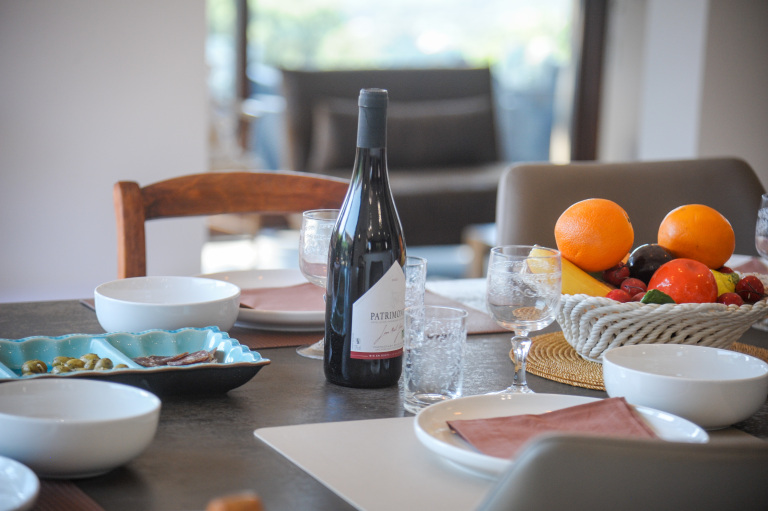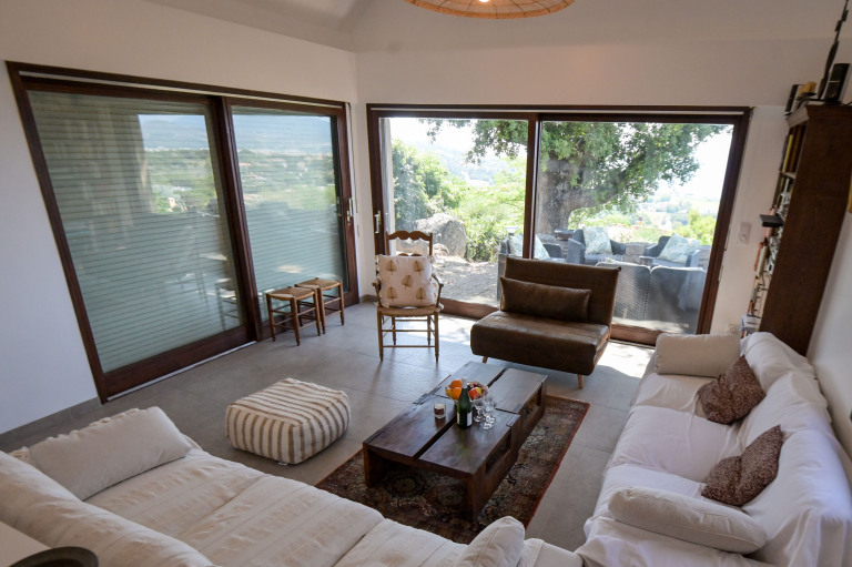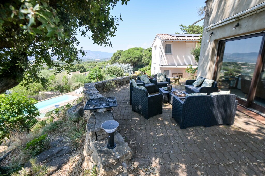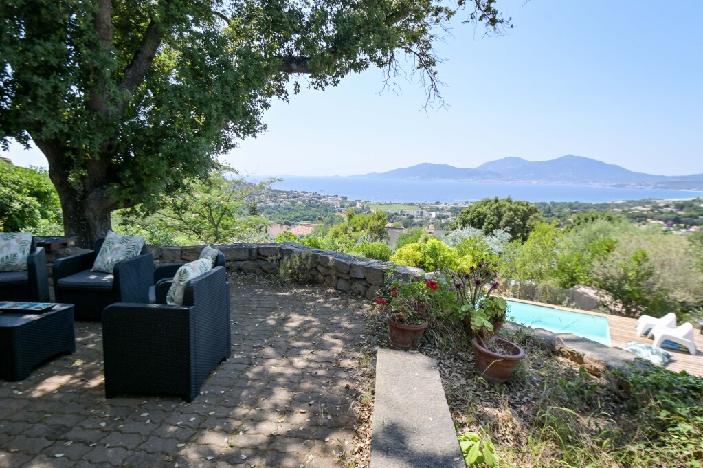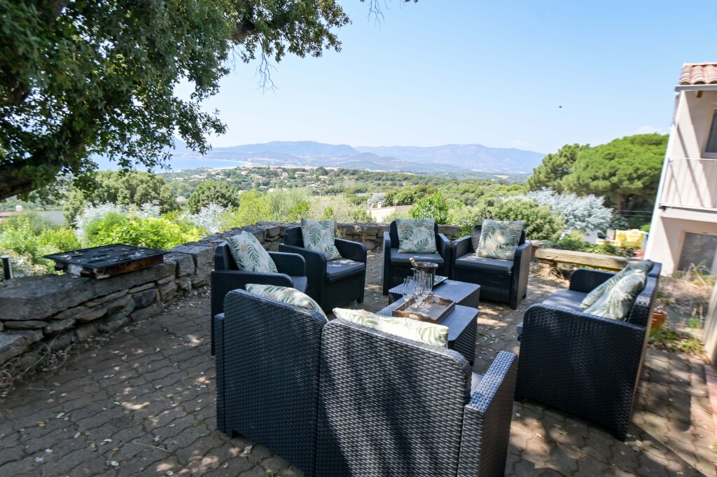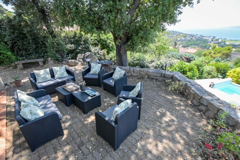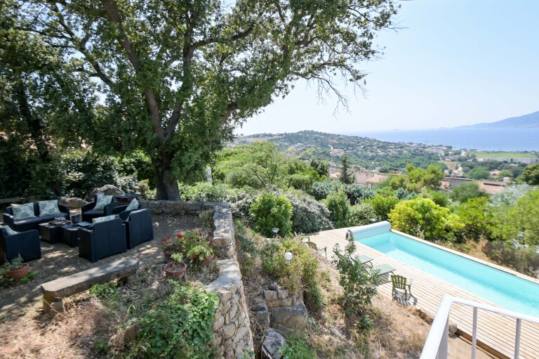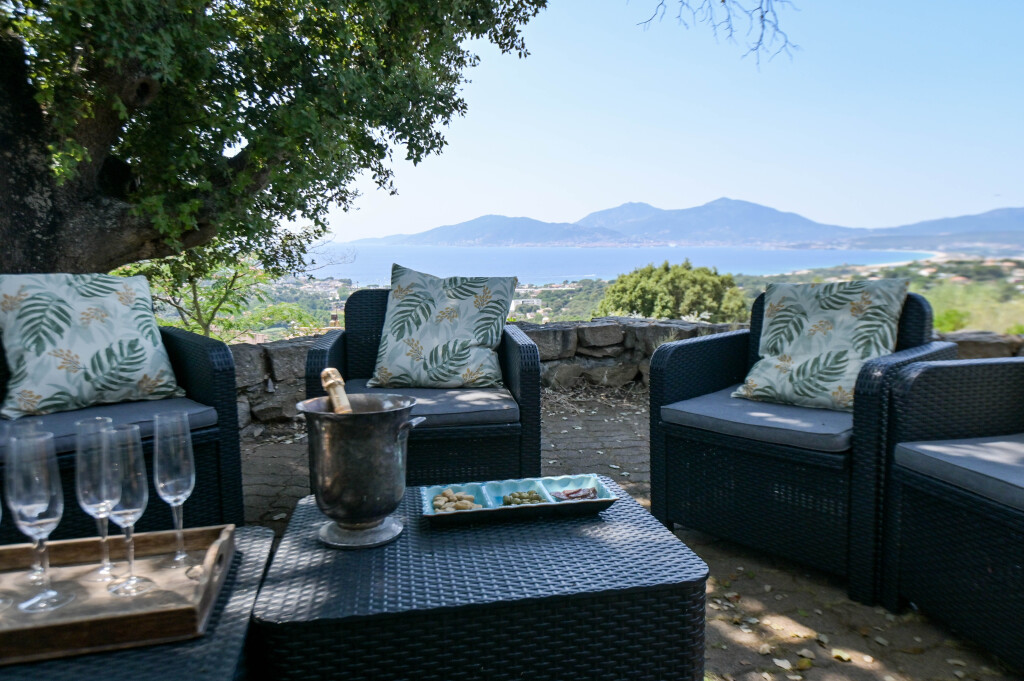 - le salon d’été à l’ombre du vieux chêne, idéal pour la lecture ou l’apéritif, bénéficie d’une vue extraordinaire en surplomb sur le golfe d’Ajaccio et ses couchers de soleil.