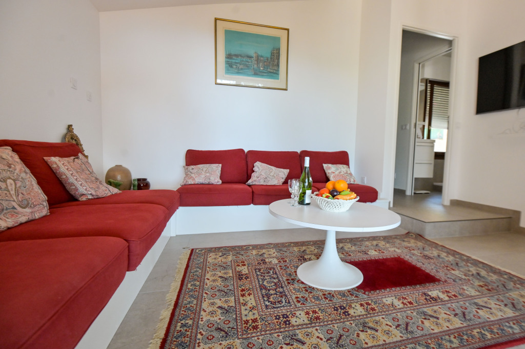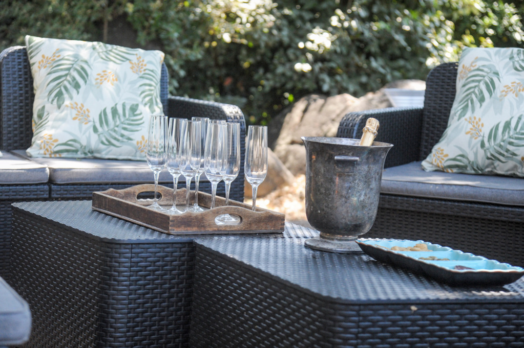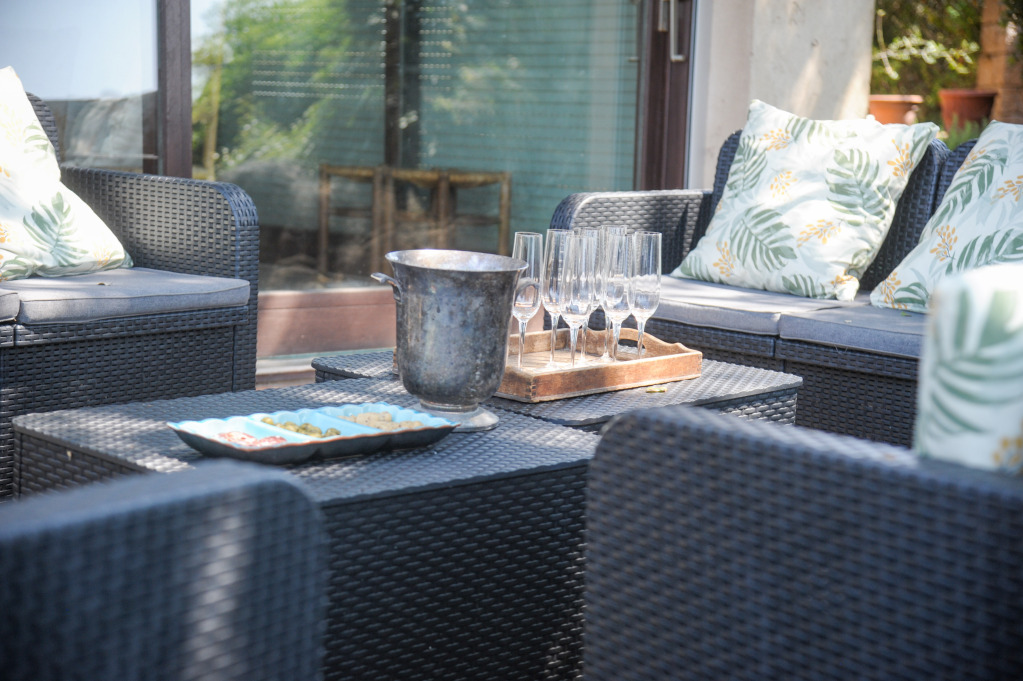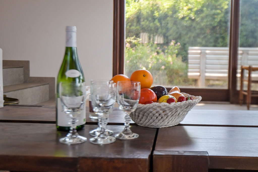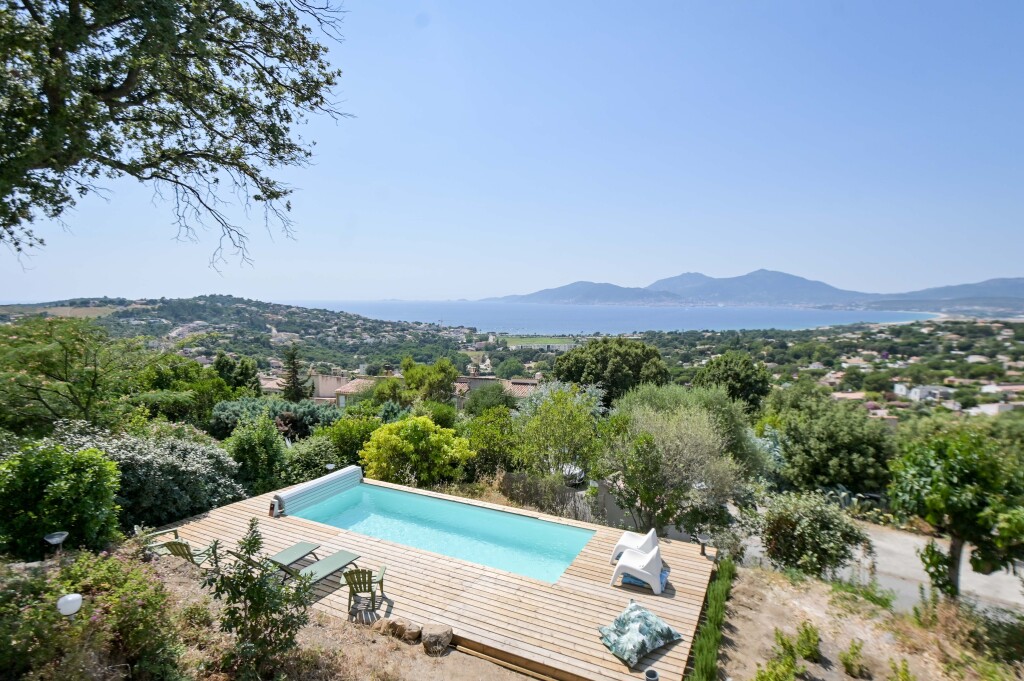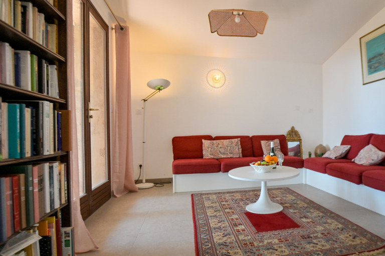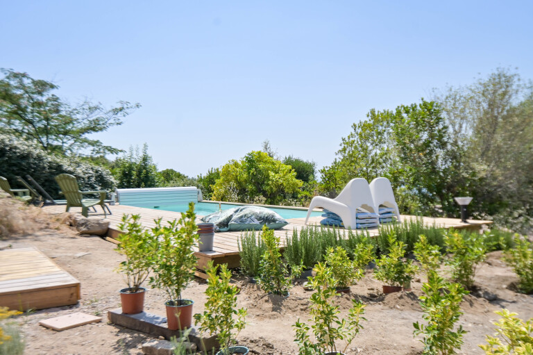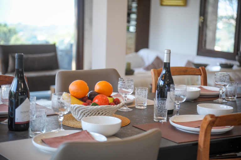 - le salon d’été à l’ombre du vieux chêne, idéal pour la lecture ou l’apéritif, bénéficie d’une vue extraordinaire en surplomb sur le golfe d’Ajaccio et ses couchers de soleil.