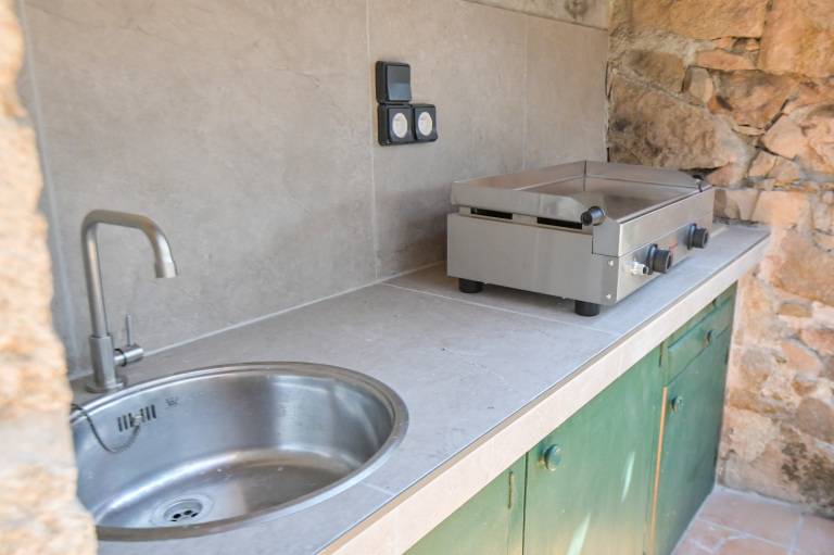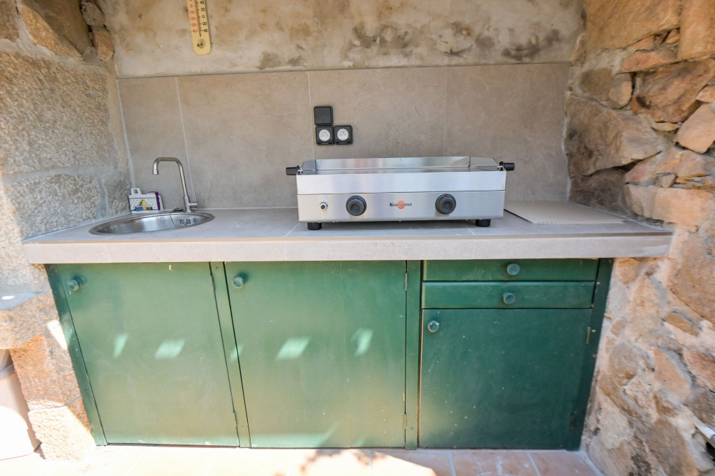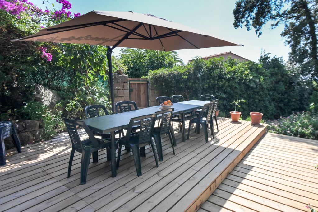- le patio repas, sa grande table, son parasol géant, sa cuisine d’été équipée d’une belle plancha, parfait pour les repas en plein air.