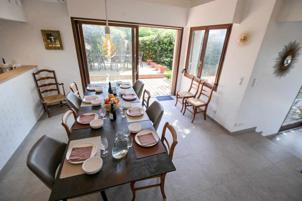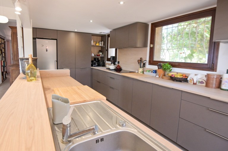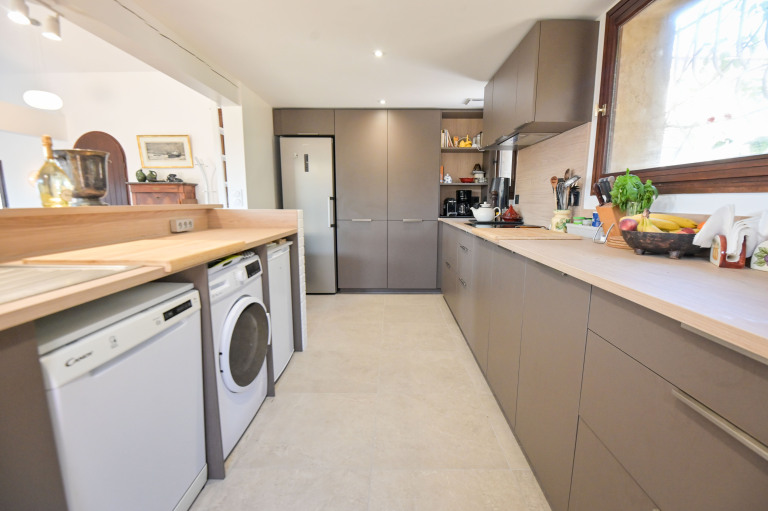 - Large cuisine moderne offrant de très nombreux équipements (plaques induction, four, micro-ondes, lave-vaisselle, lave-linge, réfrigérateur grande capacité, congélateur, cafetières Nespresso et classique, appareil sodastream, ustensiles...) ouverte sur la salle à manger