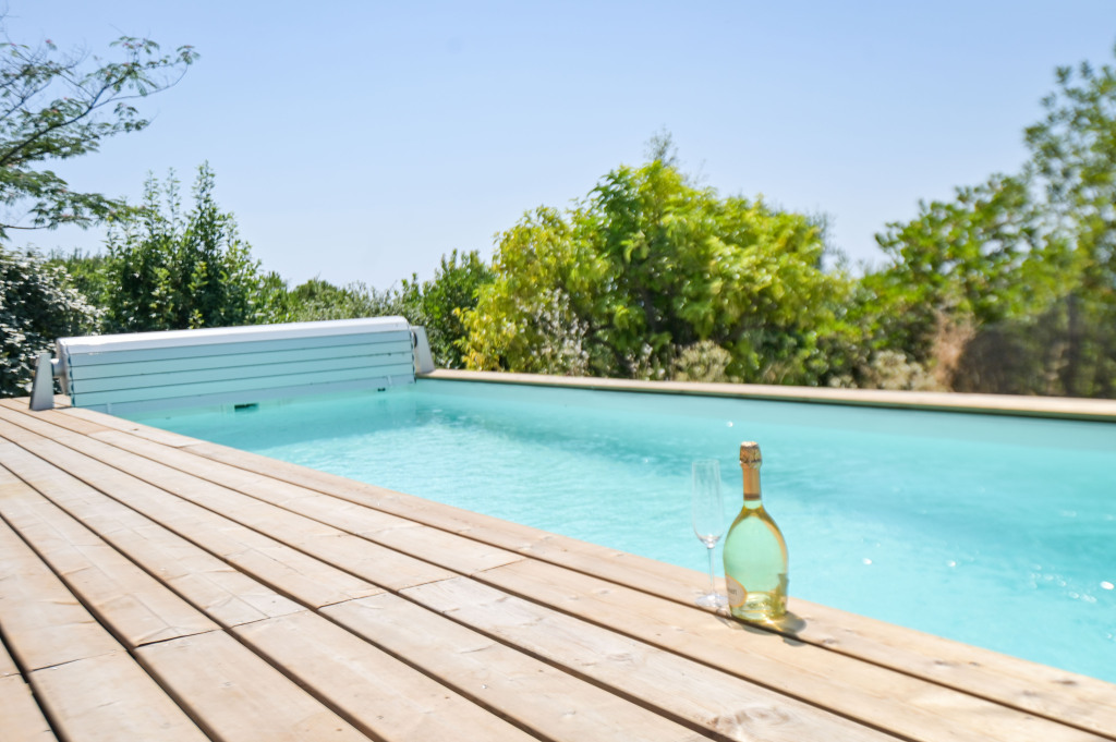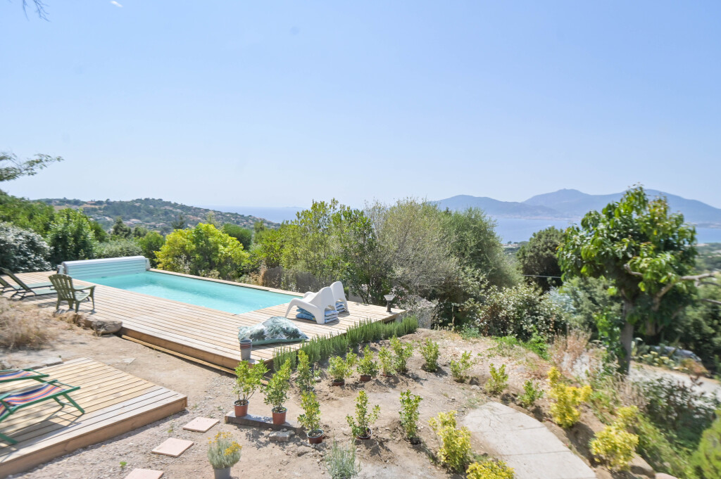 - la piscine avec vue mer et sa terrasse équipée de fauteuils et transats